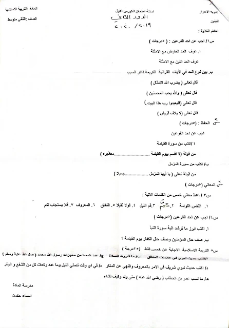 اسئلة واجوبة اسلامية ثاني متوسط نهاية الكورس الاول دور ثاني نصف السنة