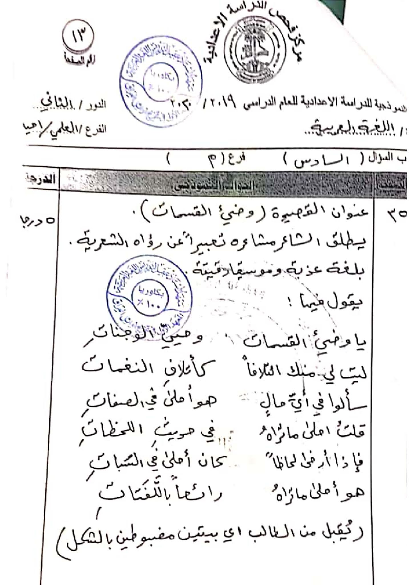الاجوبة النموذجية عربي سادس احيائي الدور الثاني 2020 من مركز الفحص