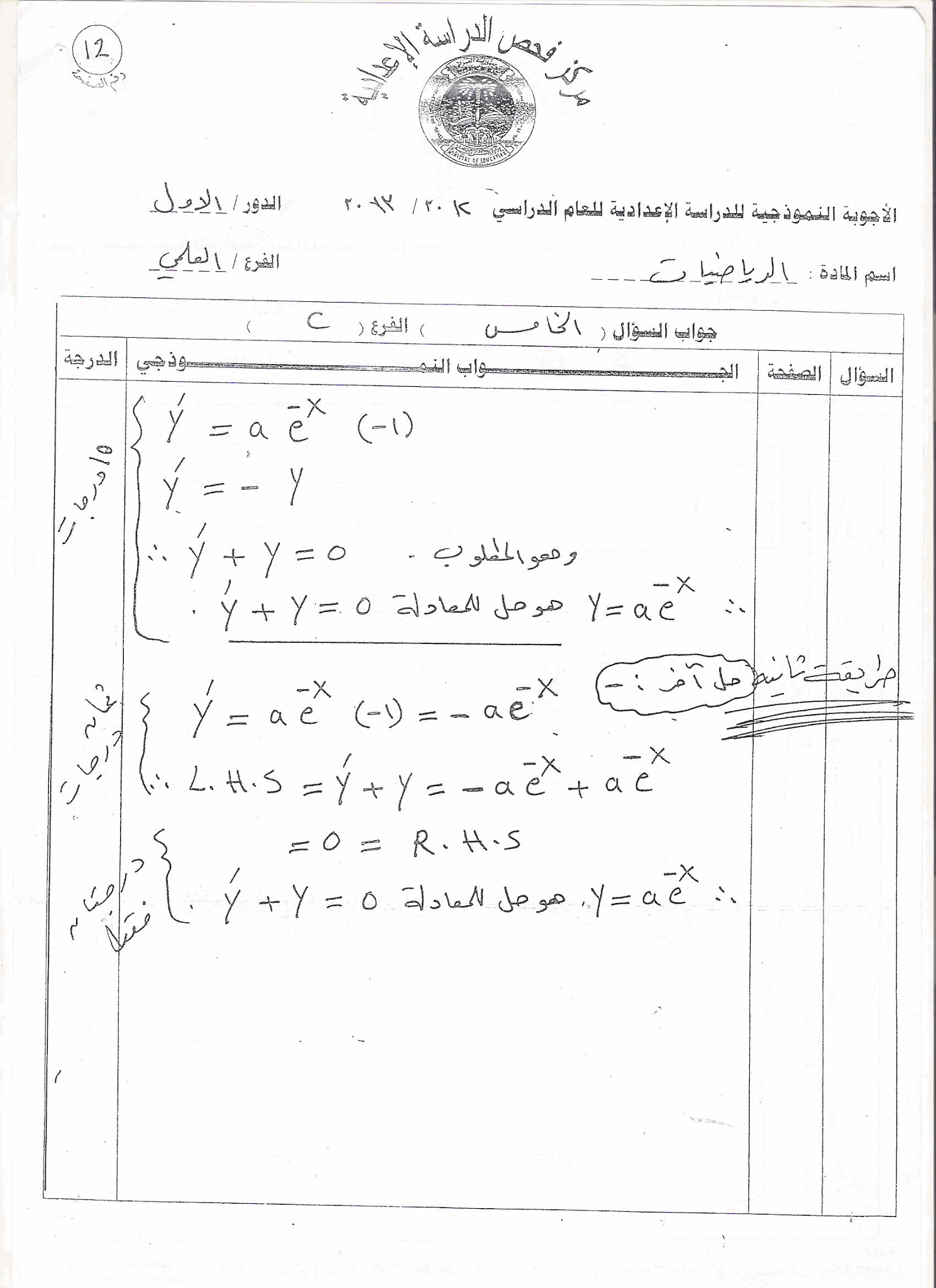 الاسئلة مع الاجوبة النموذجية رياضيات سادس علمي 2013 دور اول وزاري بكالوريا