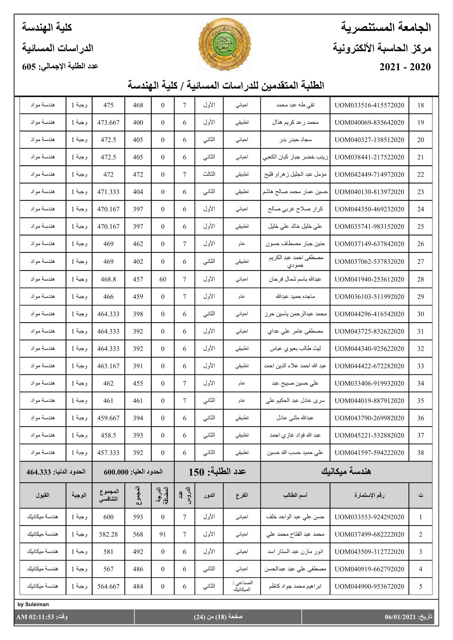 قبولات الدراسه المسائيه لجامعه المستنصريه كلية الهندسة للعام 2021