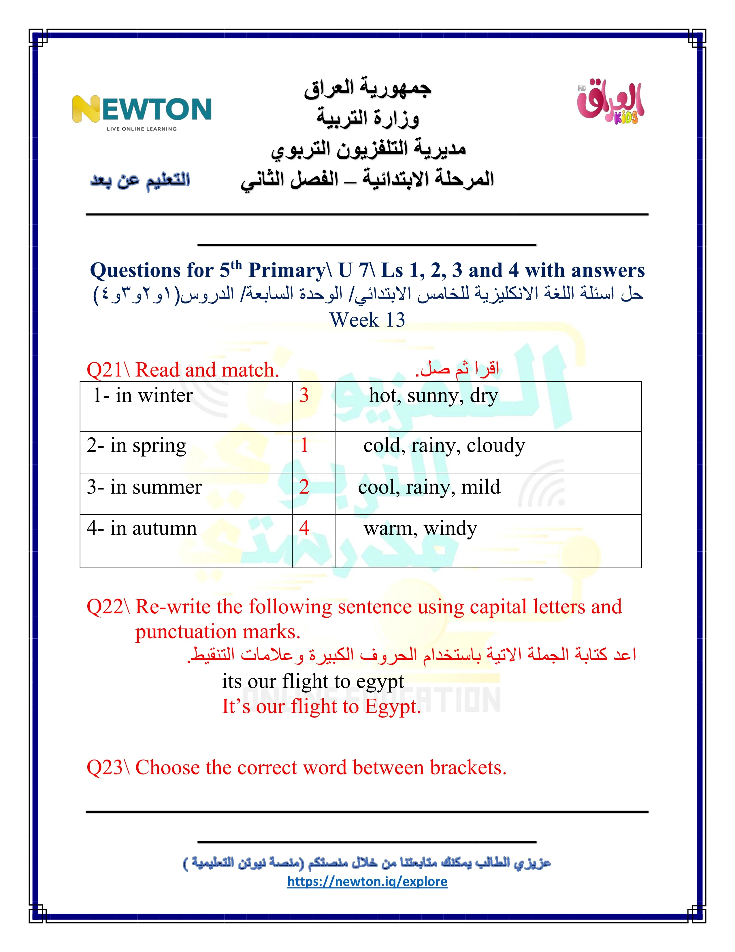 حل اسئلة انكليزي خامس ابتدائي الاسبوع الثالث عشر التلفزيون التربوي |