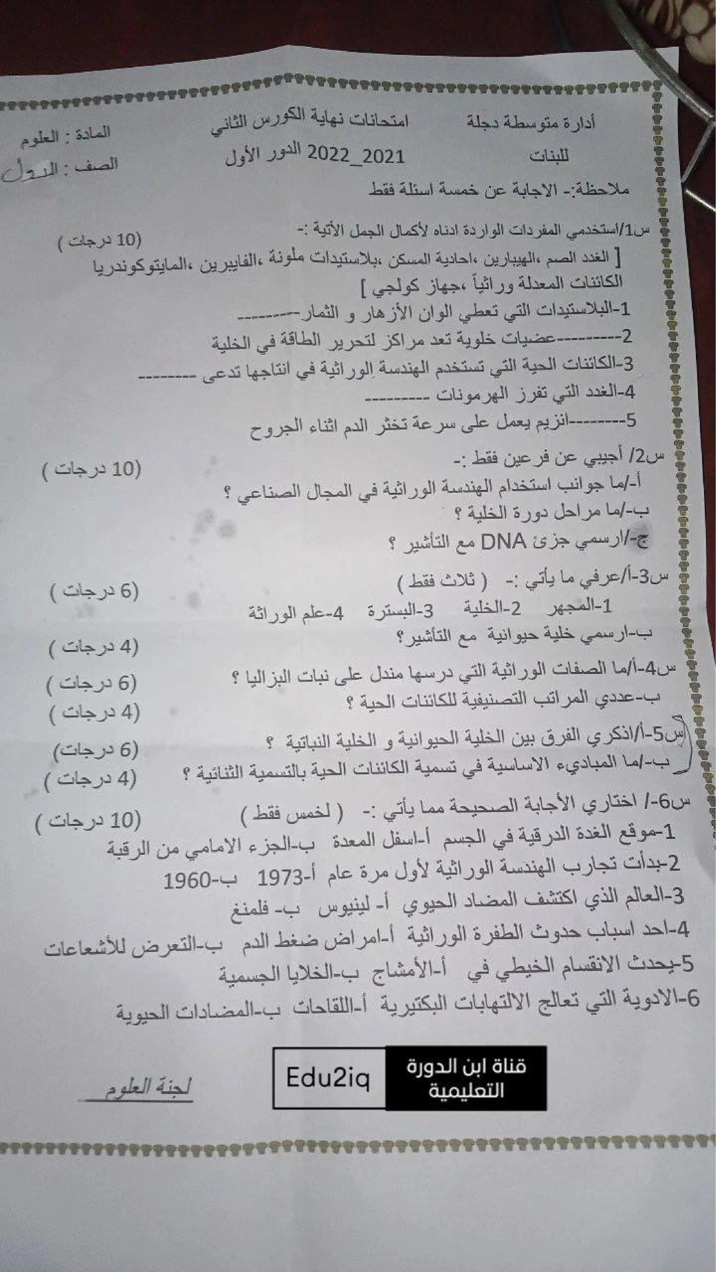 | اسئلة فقط صف الاول المتوسط مادة علوم نهاية الكورس الثاني 2022 اخر السنة |