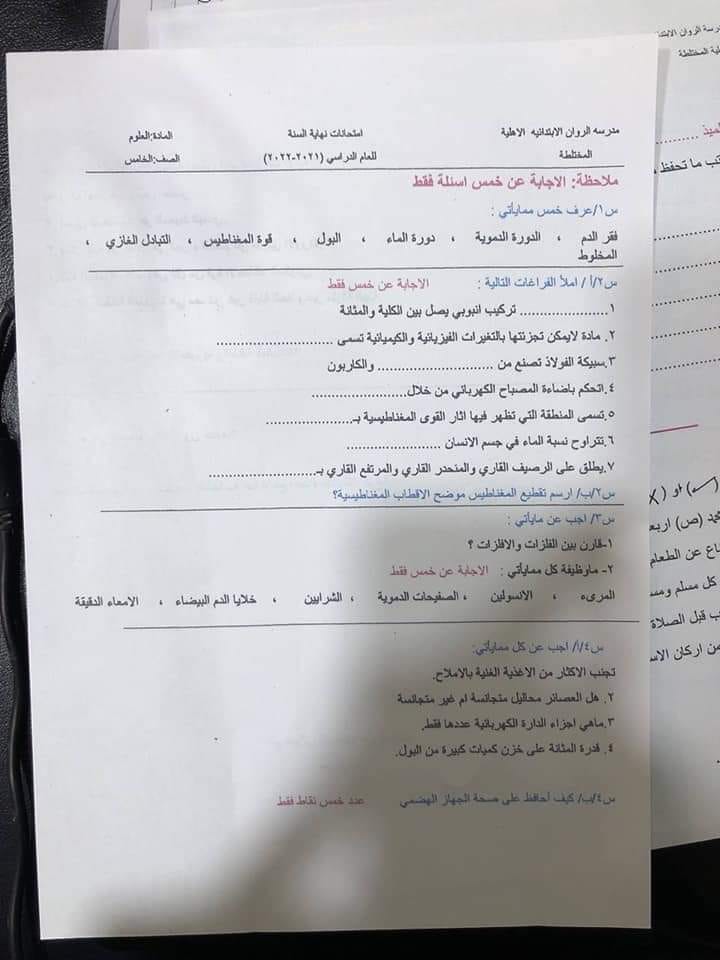 | اسئلة امتحان نهاية السنة 2022 مادة العلوم صف خامس الابتدائي |