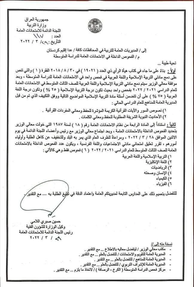 هذا الكتاب الرسمي صادر من الوزارة اللجنة الدائمة للإمتحانات