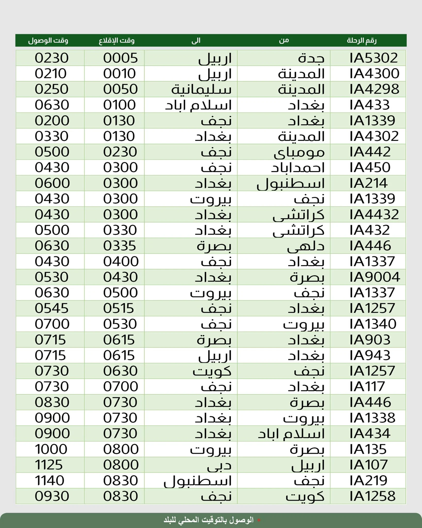 جدول رحلات الخطوط الجوية العراقية اليوم