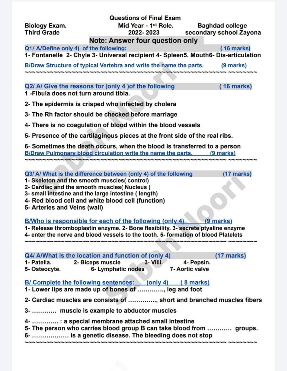 لطلبة الثالث المتوسط (المتميزين) أسئلة الأحياء مع الأجوبة النموذجية