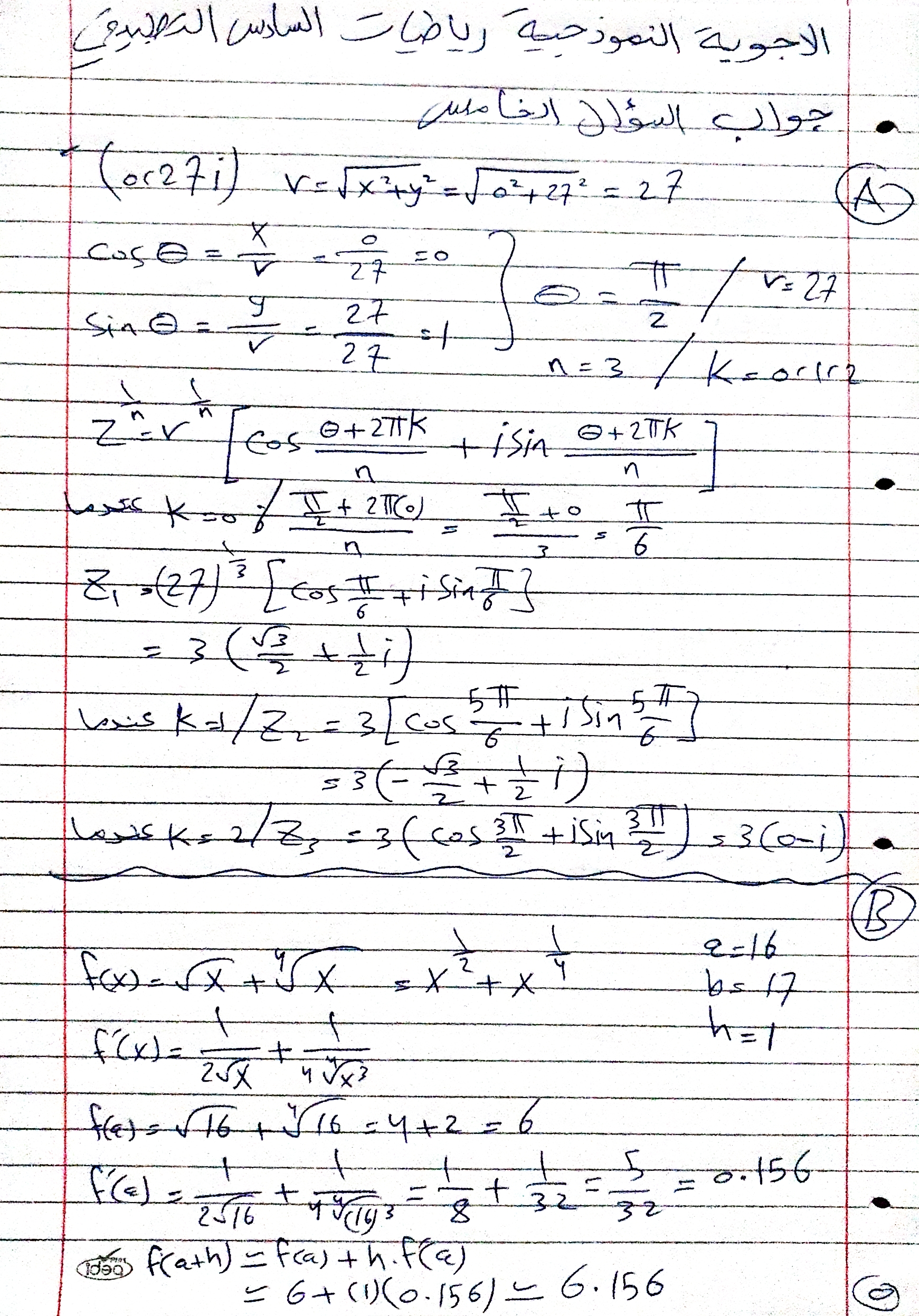 الاجوبة النموذجية اسئلة رياضيات اختبار نصف السنة السادس التطبيقي