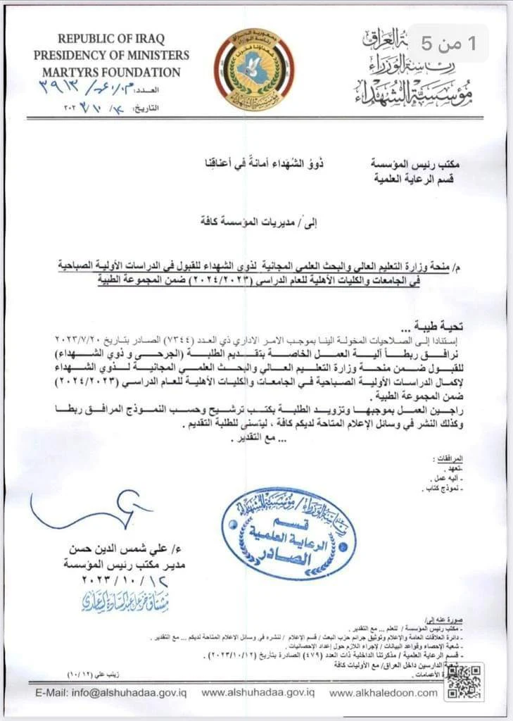 إستنادا إلى الصلاحيات المخولة الينا بموجب الأمر الاداري ذي العدد (٧٣٤٤) الصادر بتاريخ ۲۰۲۳/۷/۲۰ ترافق ربطاً آلية العمل الخاصة بتقديم الطلبة الجره ذوي الشهداء) للقبول ضمن منحة وزارة التعليم العالي والبحث العلمي المجانية لذوي الشهداء لإكمال الدراسات الأولية الصباحية في الجامعات والكليات الأهلية للعام الدراسي (٢٠٢٤/٢۰۲۳) ضمن المجموعة الطبية. راجين العمل بموجبها وتزويد الطلبة بكتب ترشيح وحسب النموذج المرافق ربطا وكذلك النشر في وسائل الإعلام المتاحة لديكم كافة ، ليتسنى للطلبة التقديم . . مع التقدير