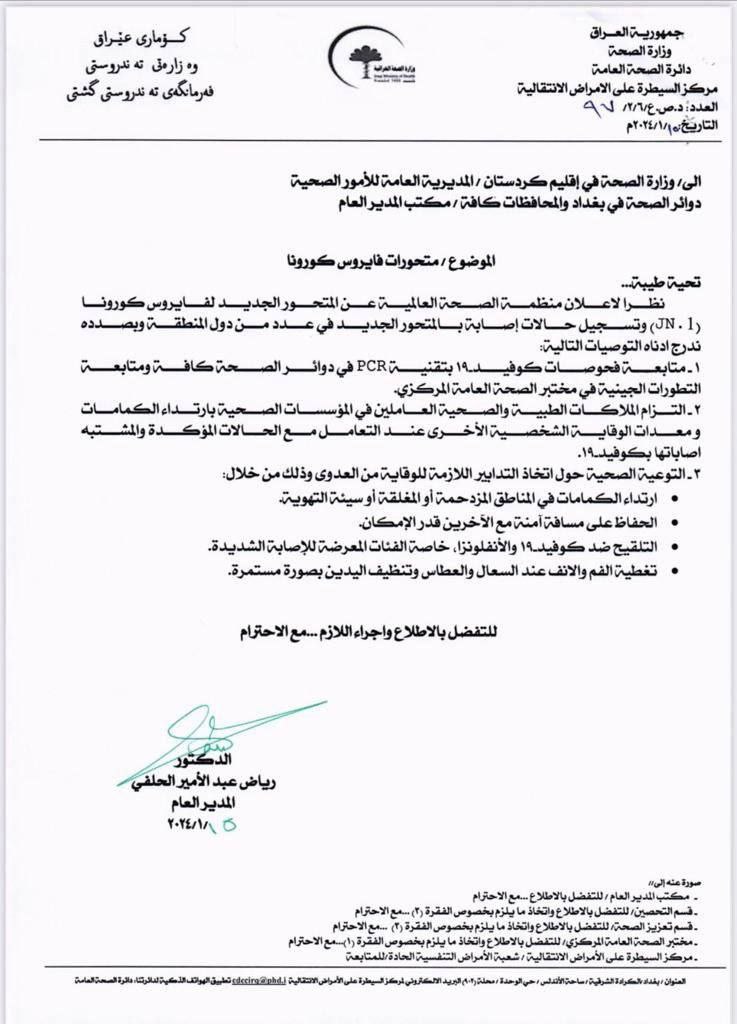كتاب رسمي من وزارة الصحة العراقية حول انتشار المتحور الجديد للفيروس 2024