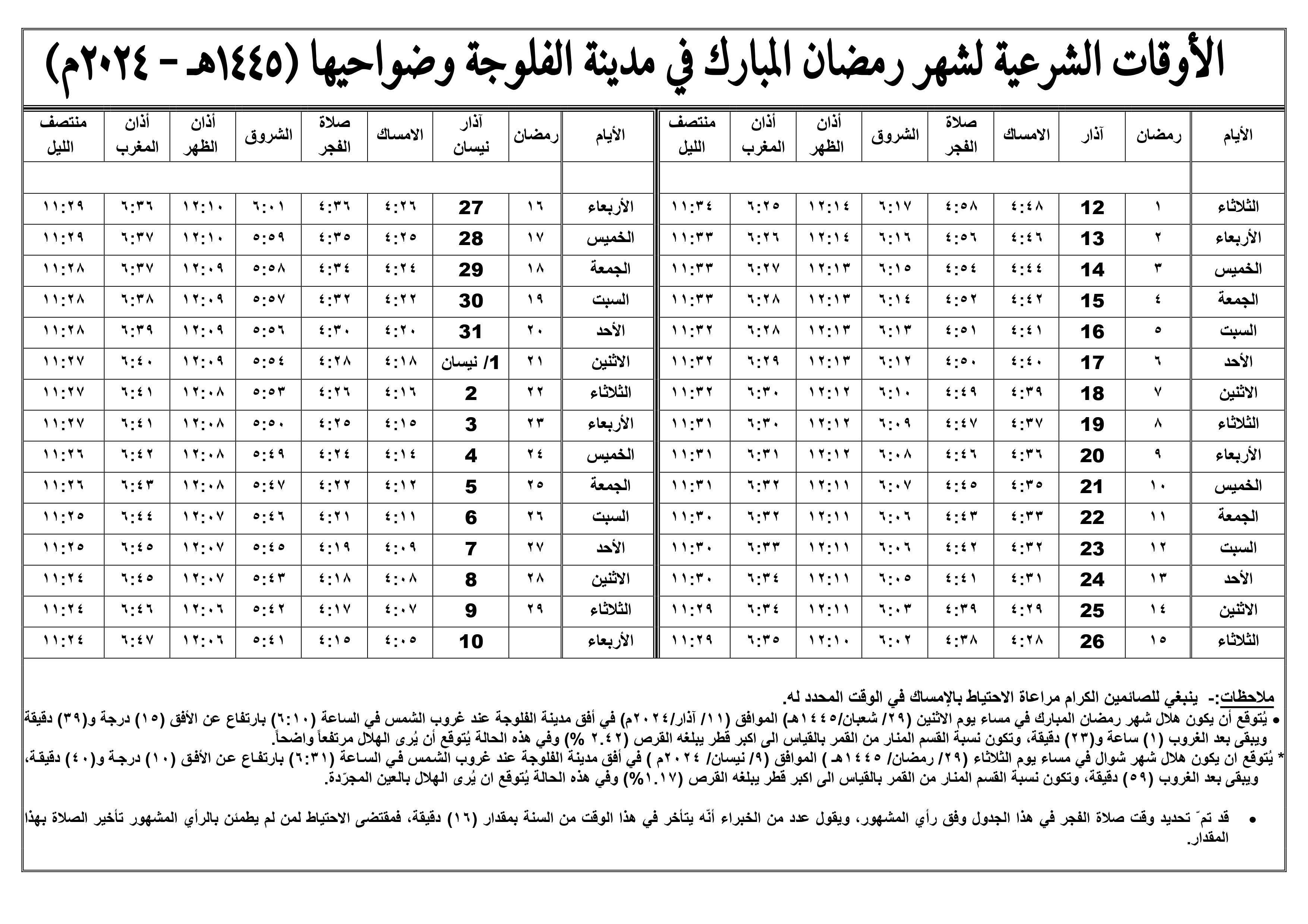 مواقيت الصيام والفطور لشهر رمضان مدينة الفلوجة للعام الهجري ١٤٤٥ هـ وقف شيعي للعام الميلادي ٢٠٢٤ م مرجع سيستاني