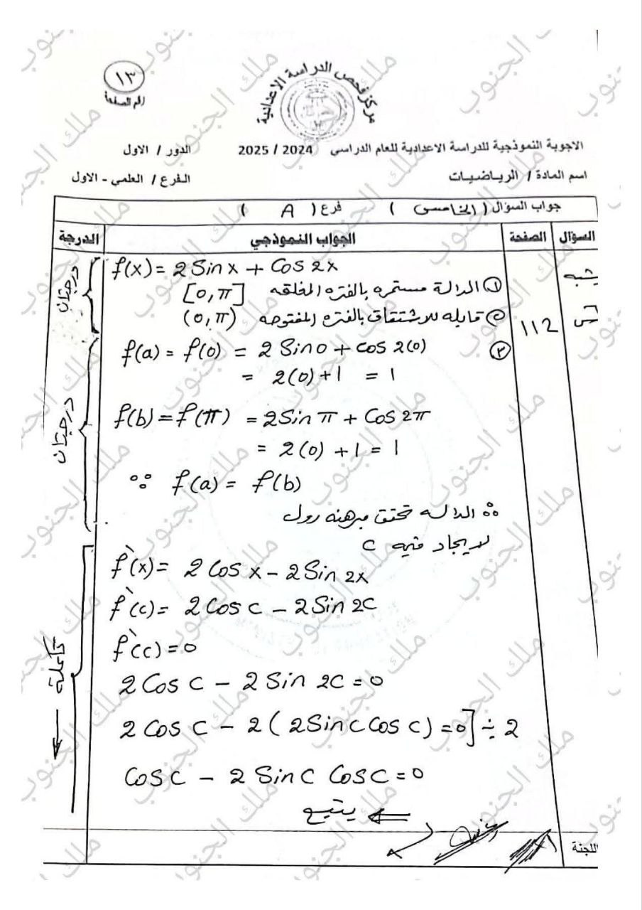 أسئلة مع اجوبتها امتحان دور اول صف سادس علمي 2025 مادة رياضيات